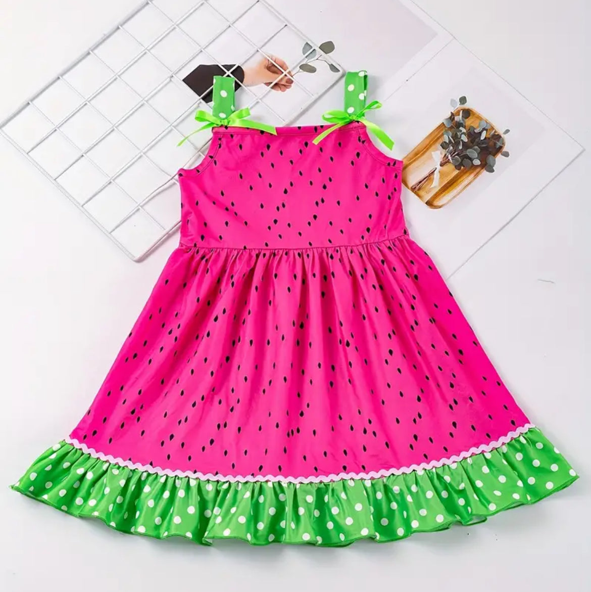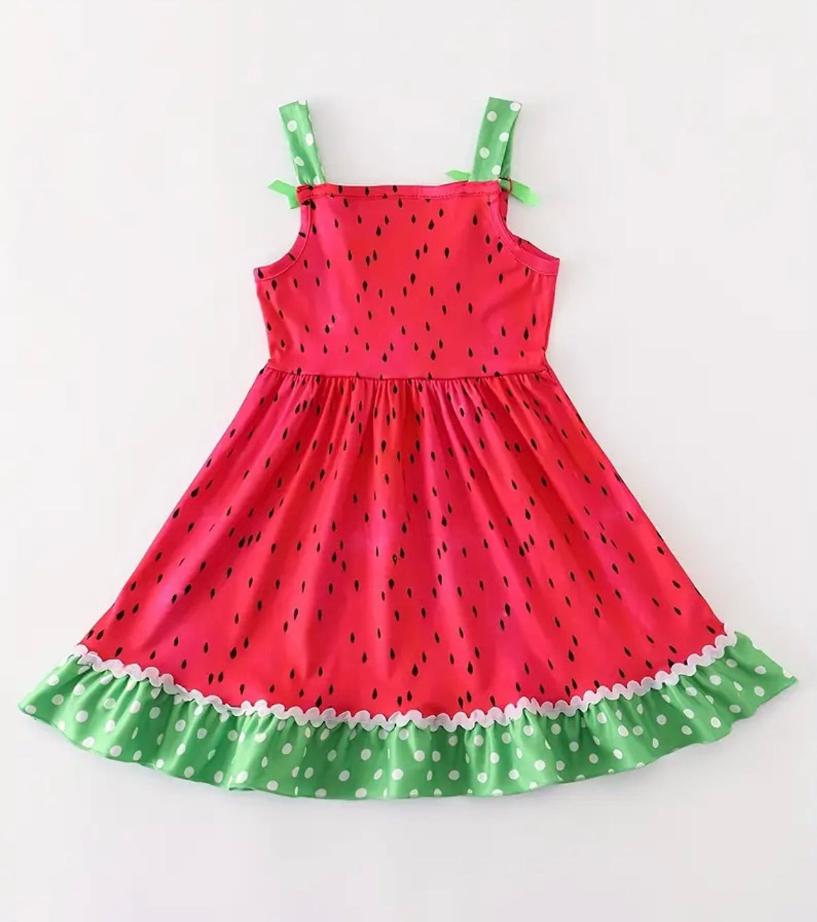 Made of a polyester blend material. Great slip on romper with watermelon design and ruffle top. Fits TTS. 1-3 weeks delivery