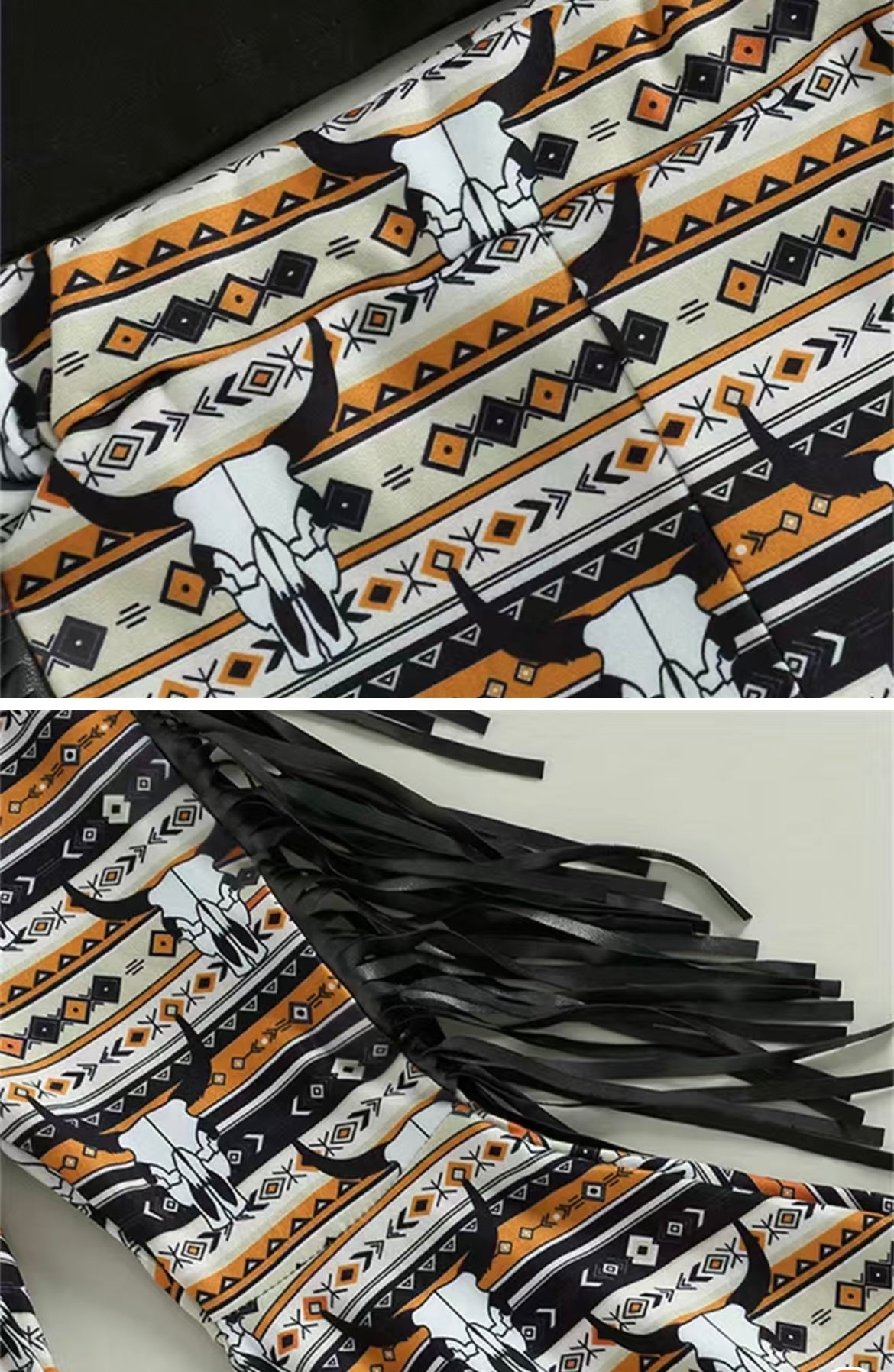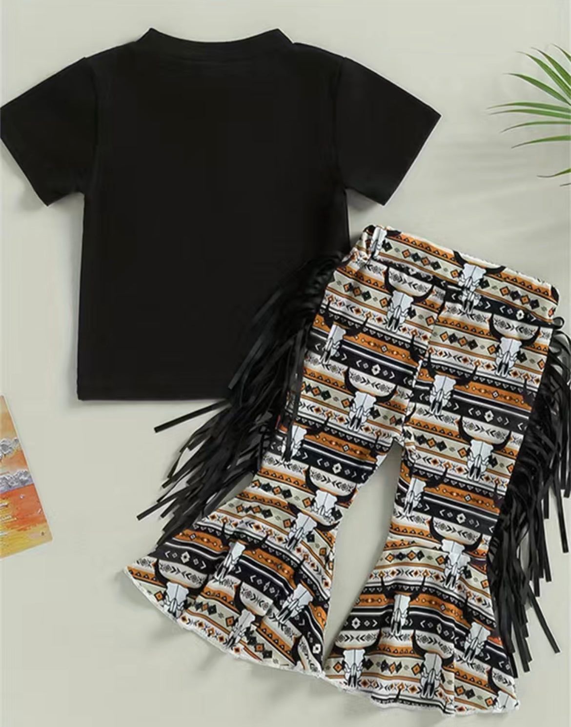 Made of a cotton/polyester fabric.  Cute black top with farm baby decal and western flare fringe pants. Fits TTS. 1-3 weeks delivery