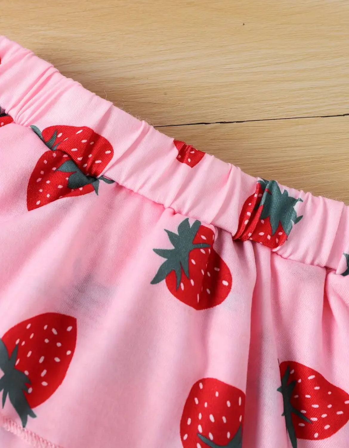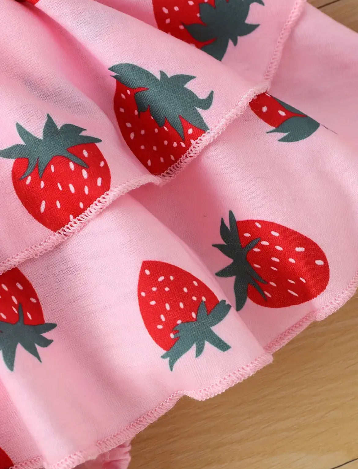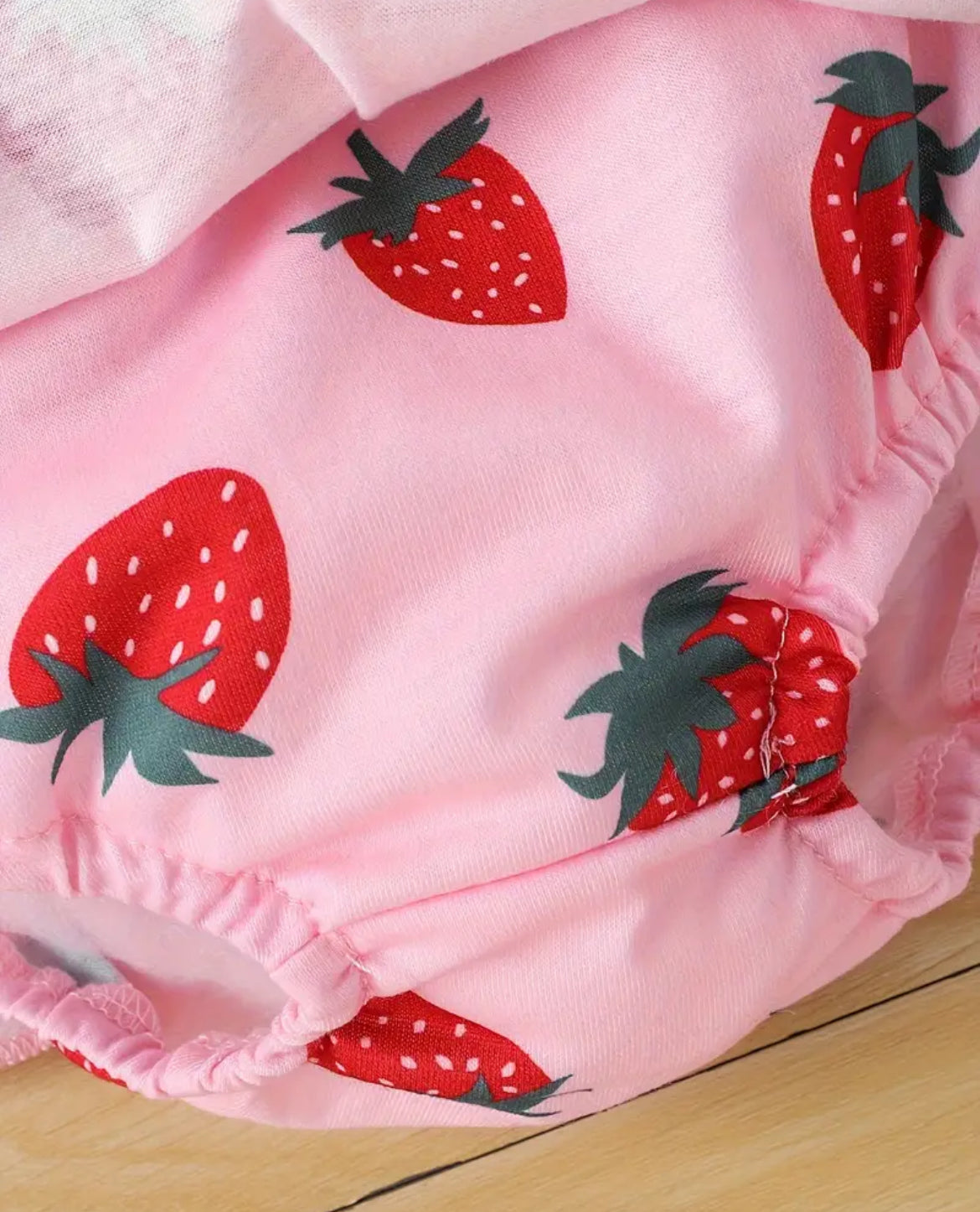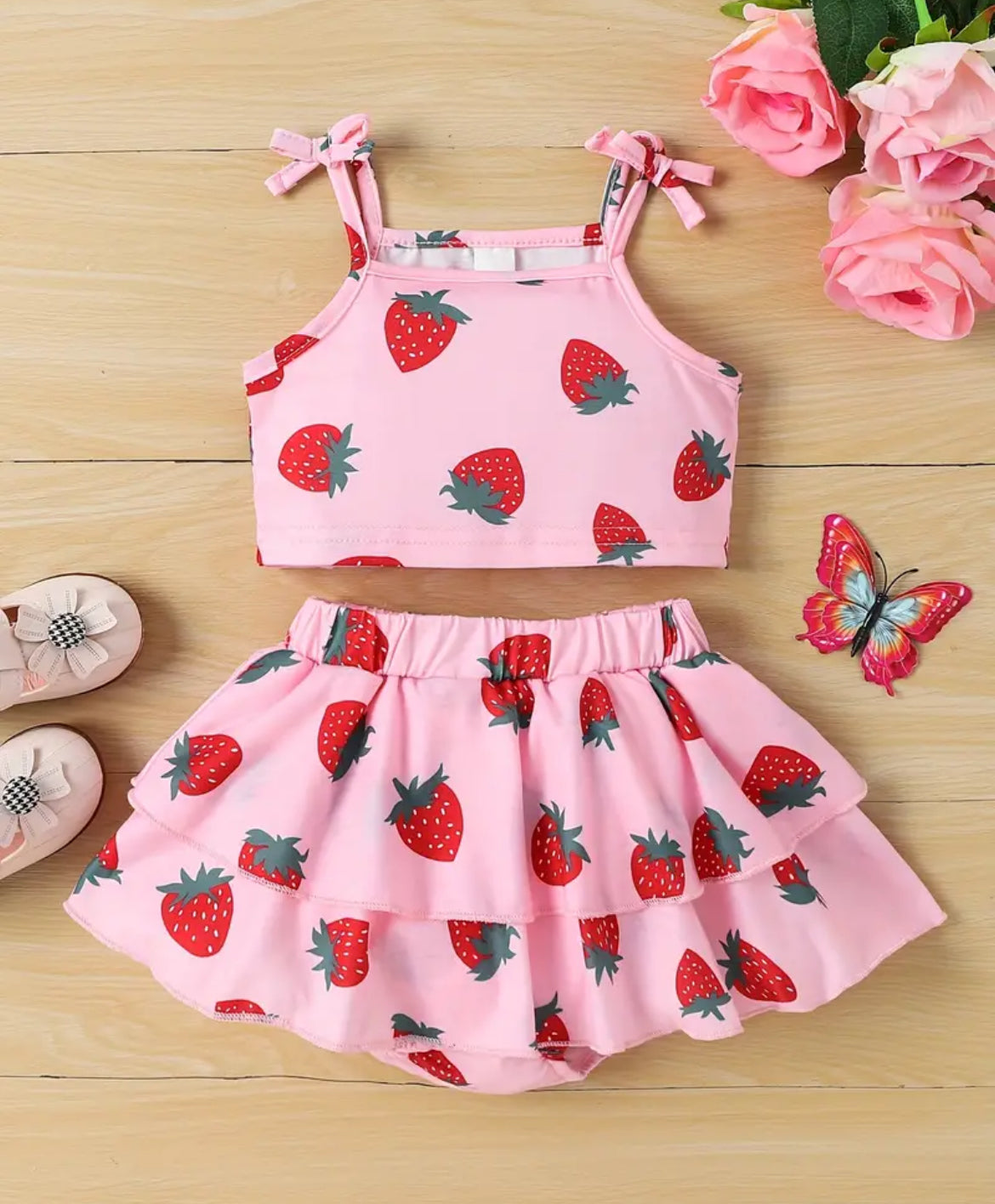 Made of a polyester blend material. Cute strawberry design. Comes with Spaghetti strap tie top and matching ruffled bummies. Fits TTS. 1-3 weeks delivery.
