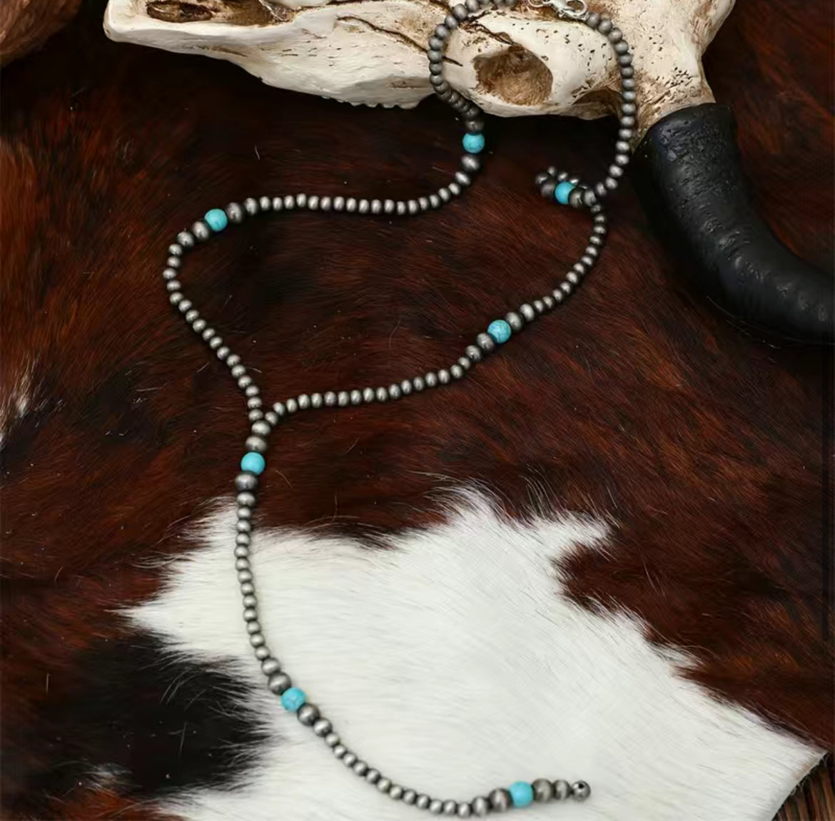 Great Navajo pearl with accent turquoise beads. Lasso style necklace great with sweaters. Size in pictures. 1-3 weeks delivery