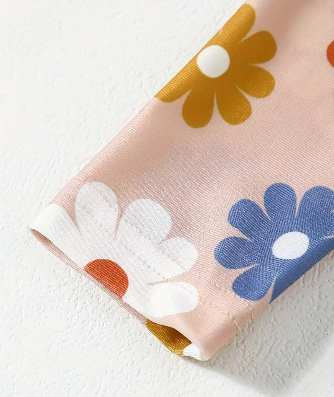 Polyester blend material. Cute flower zipper front, long sleeve one piece swimsuit. Has matching hat. Fits TTS. 1-3 weeks delivery