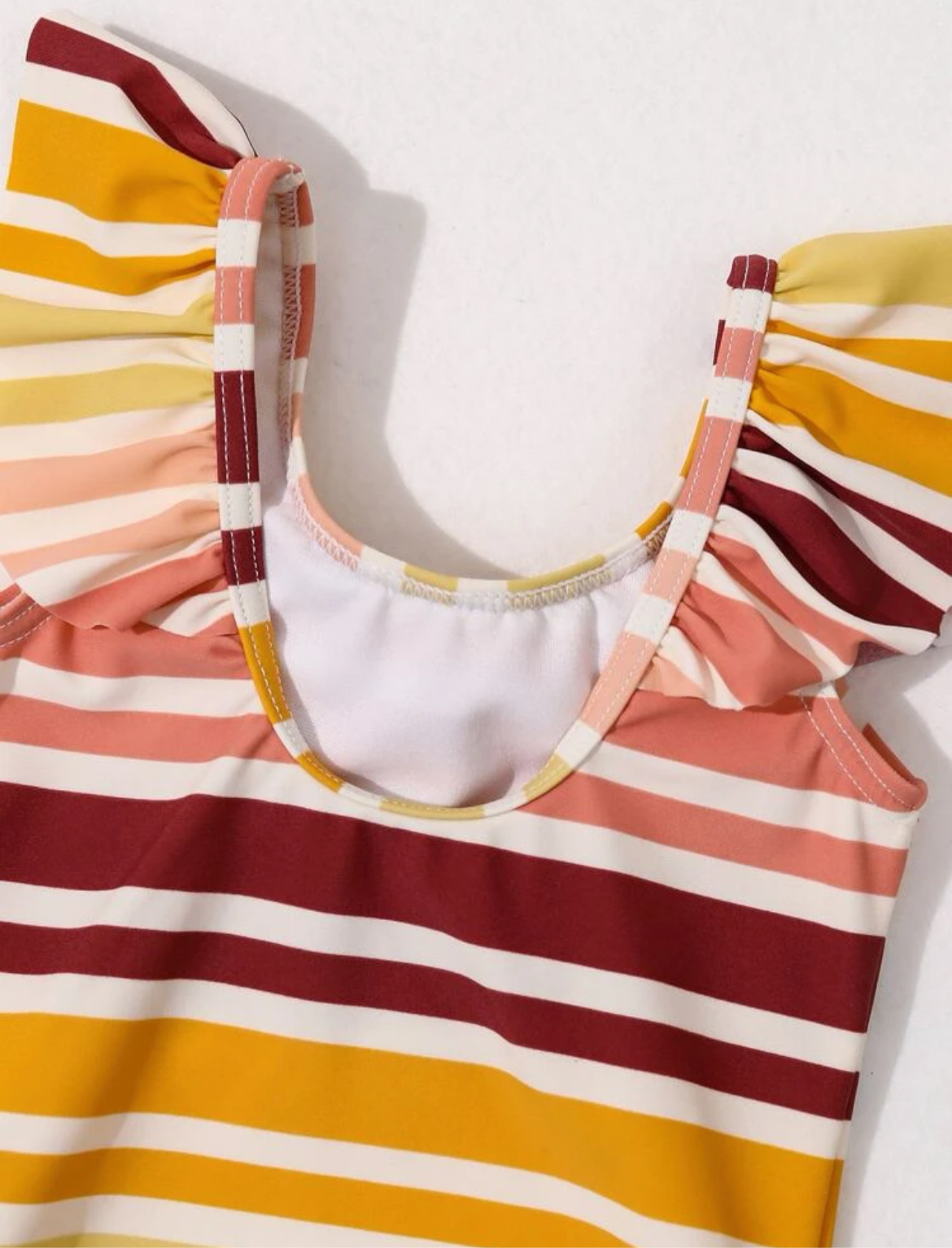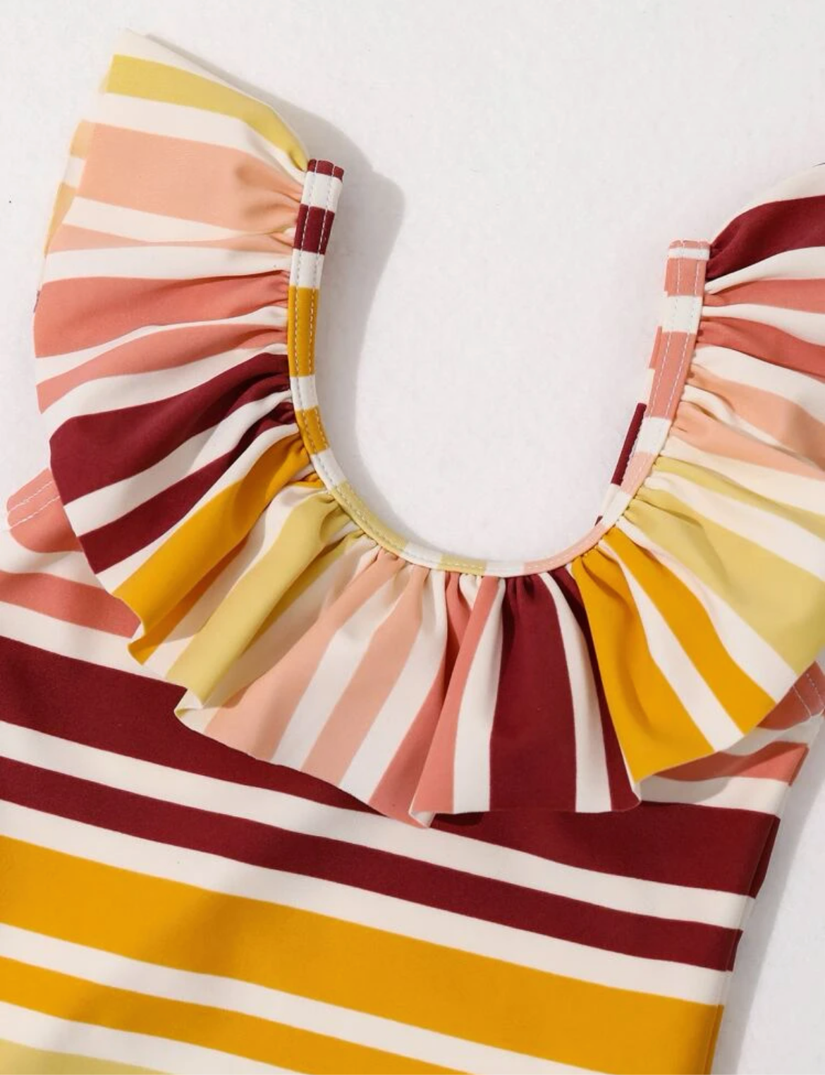 Polyester blend material. Cute striped design one piece with ruffled front and shoulders. Fits a bit smaller. 1-2 weeks delivery